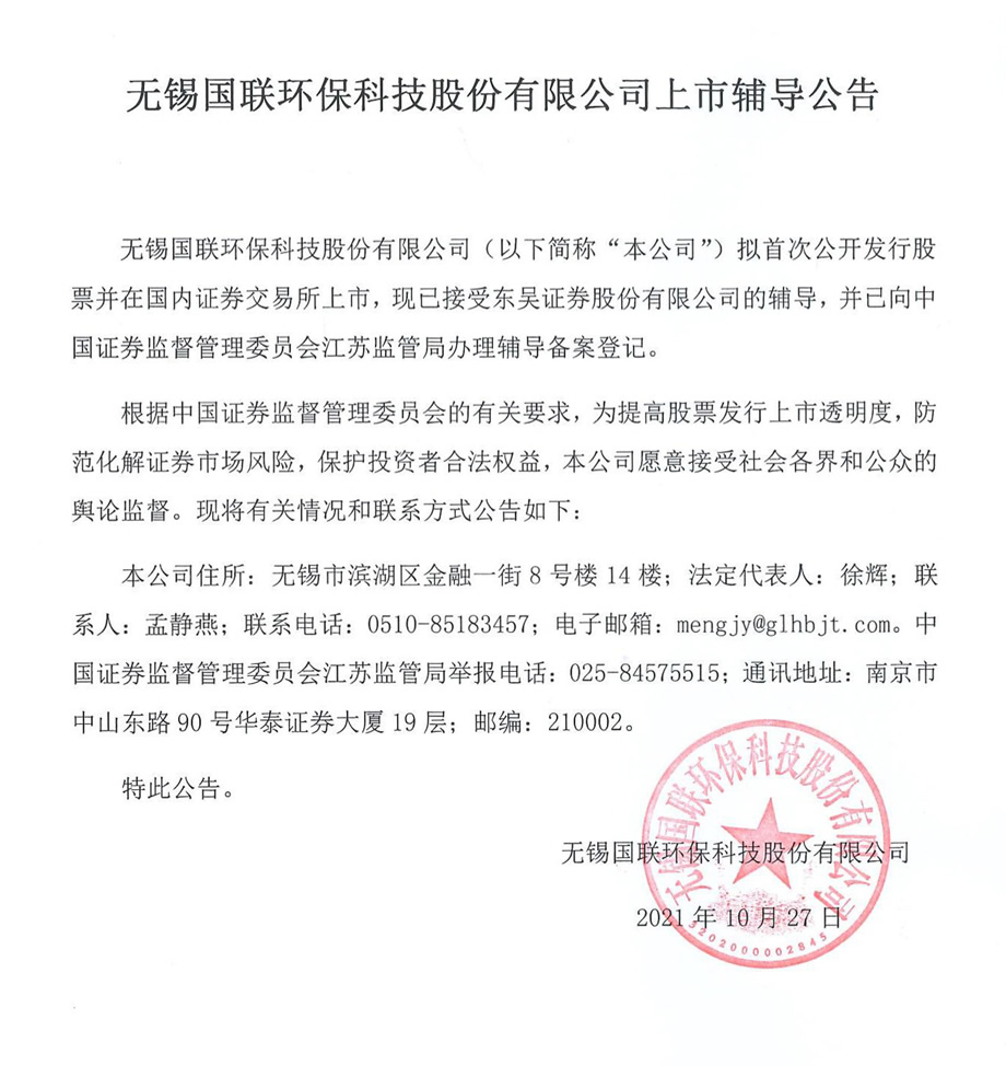 無錫國聯環??萍脊煞萦邢薰境闪⒂?011年1月27日,是一家以污泥減量化、無害化、資源化處置為產業化發展的國有控股企業,股本為109,470,852元。